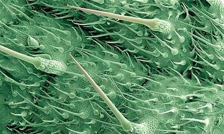 Here is an extreme close up of the surface of a stinging nettle leaf using a colour enhancing electron micrograph. As you can see, there is an incredible amount sharp hairs in this small section of leaf, all of which resemble a hypodermic needle. What may not be as obvious is that these hairs are actually hollow tubes. Due to the hairs having walls comprised of silica, essentially transforming the hair into a very sharp and easily broke needle. Much like a needle, the hairs will inject chemicals into whomever should be careless enough to snap it. Stored in a bulb at the base of the hairs, chemical such as acetylcholine and hydroxytryptamine are forced into the unsuspecting party, which can cause instant pain and discomfort. Accompanying this cocktail of fun is histamine, which brings on inflammation and can cause further discomfort in the form of a burning sensation.